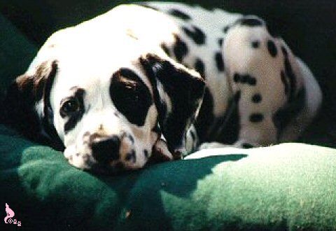 Charlin’s Destinie was our first AKC Dalmatian. She was born May 5th, 1996. She’s a typical Dalmatian, often aloof, hyper and ready to run or swim for ever! She loves protecting her territory, even from the squirrels that traverse the tree tops. It’s a sight when she’s jumping up and down on her hind legs trying desperately hard to get up there and catch them.